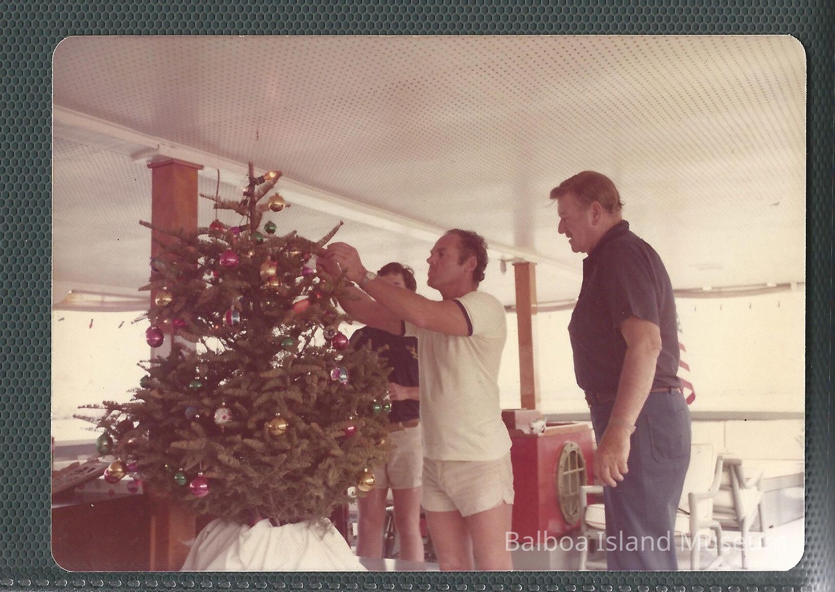 John Wayne, Bert Minshall, and another man decorate a Christmas tree on The Wild Goose.Lexicon
