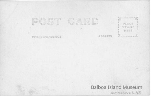 A black and white postcard of North Bay Front on Balboa Island between the 900 block and 500 block. There is no development on the land opposite the island. The Spencer Lighthouse is visible on the left side of the card.