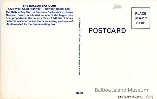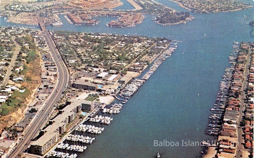 A color aerial photograph postcard showing the Balboa Bay Club, Bayshore, Linda Island, Harbor Island, and the PCH Bridge.