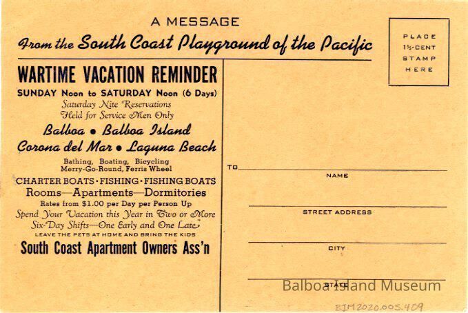 A brown cardstock postcard advertisement sent out by the South coast Apartment Owners Association reminding people about Wartime Vacation restrictions and rates in Newport and Laguna Beach, including the holding of rooms for Service Men Only on Saturday nights.