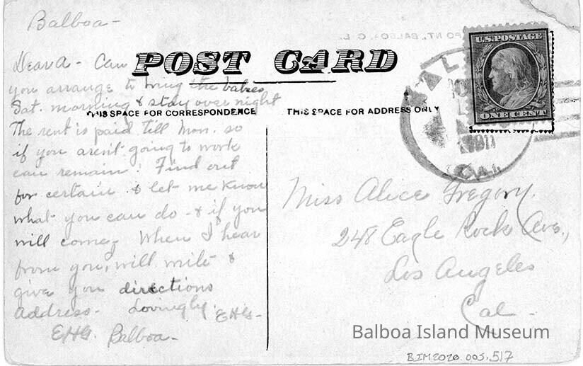 Sent in 1911 from Balboa (the stamp is smeared, making the date and time illegible). Sent to Miss Alice Gregory by EHG.