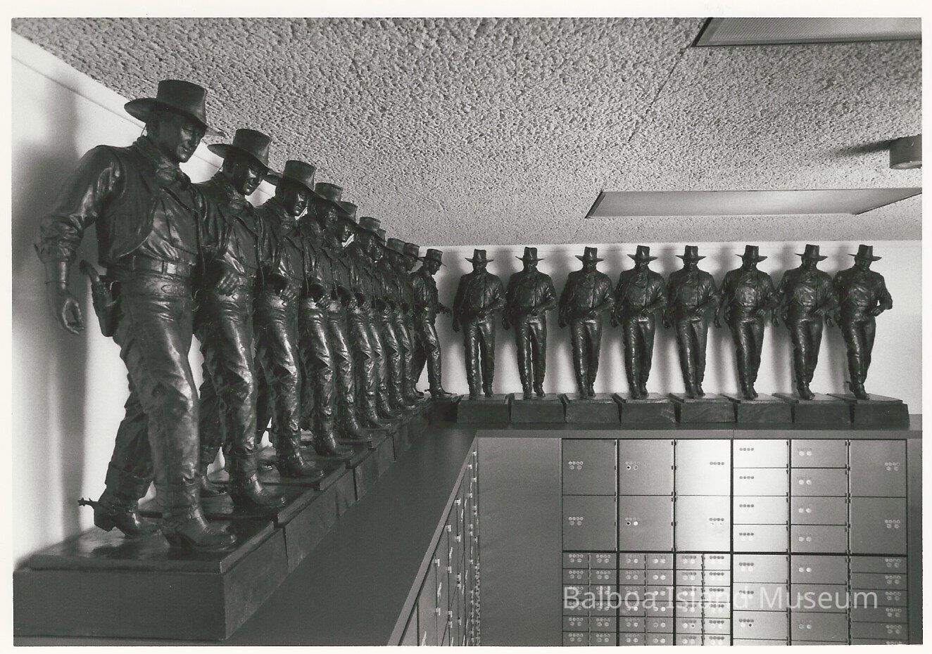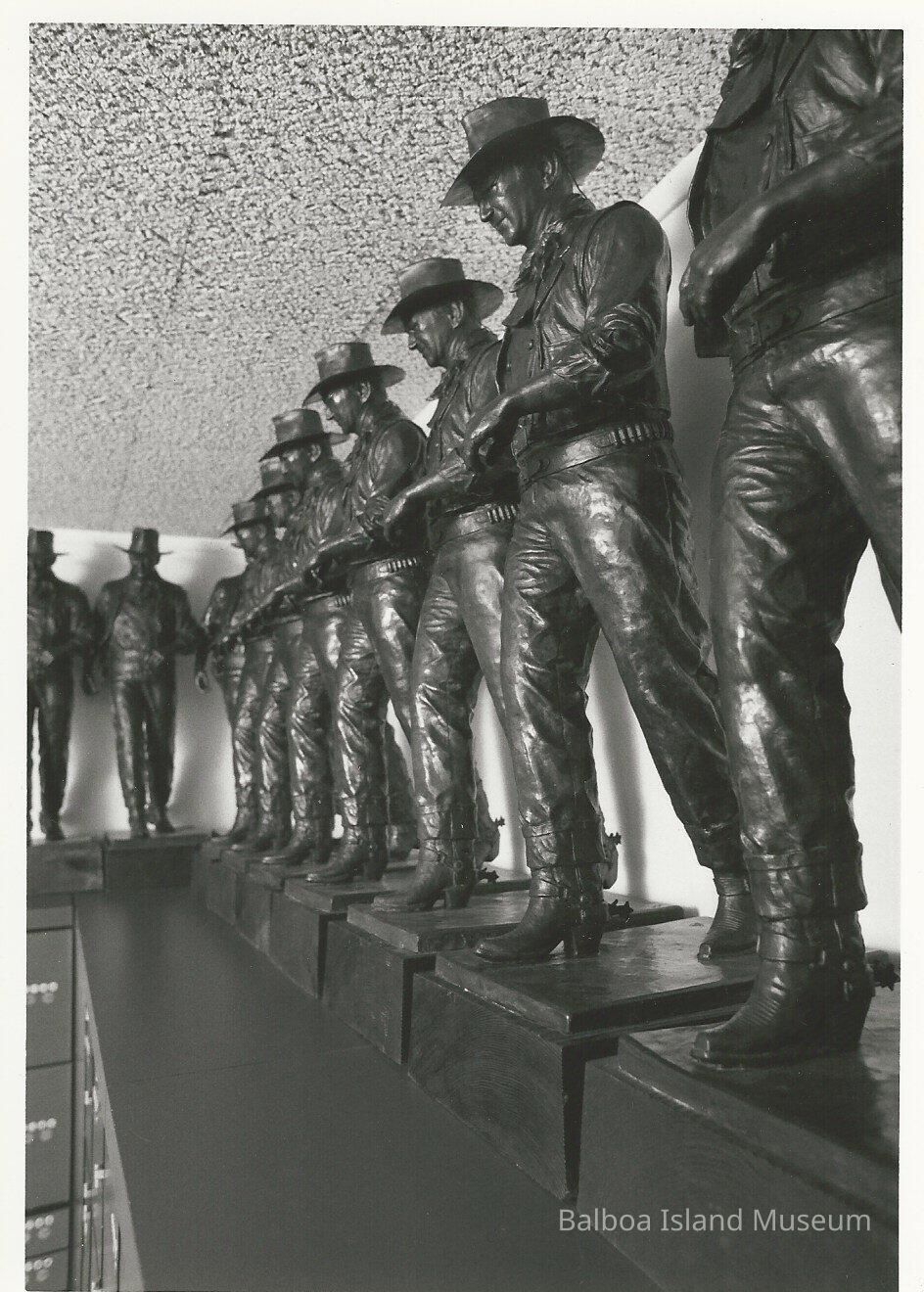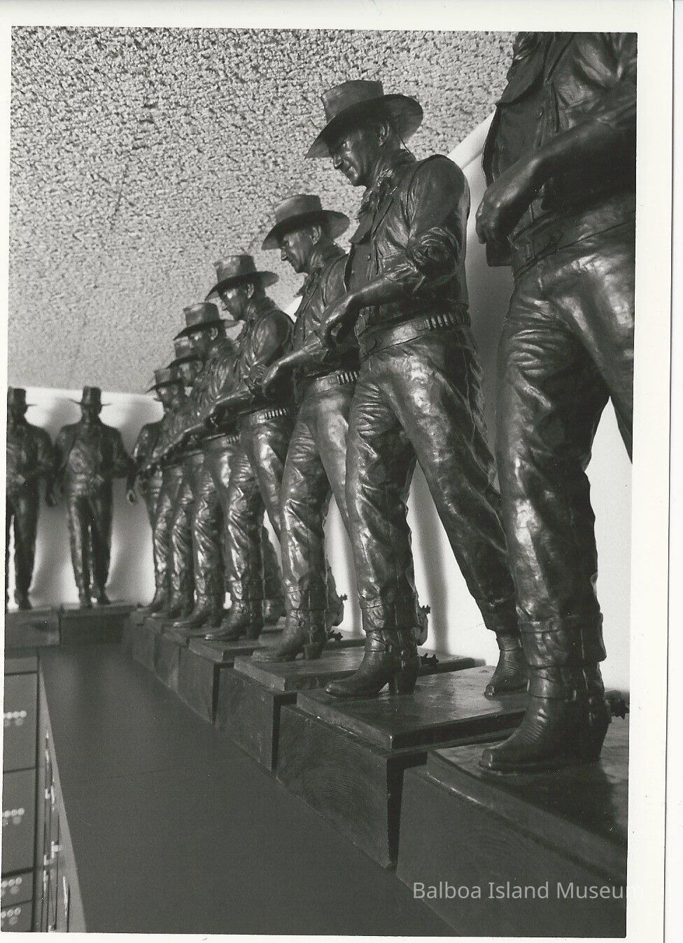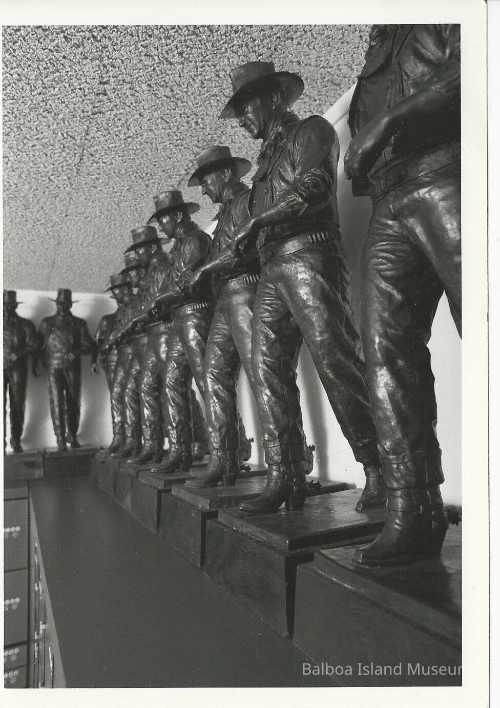 Black-and-white photographs of bronze John Wayne statues on lockers.