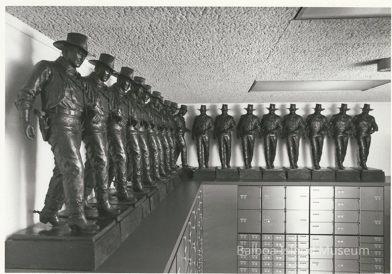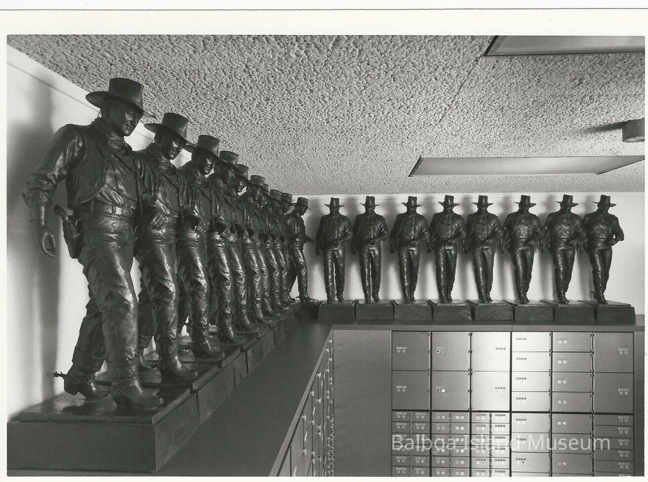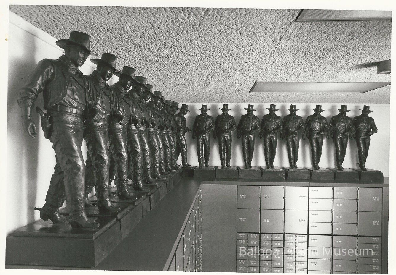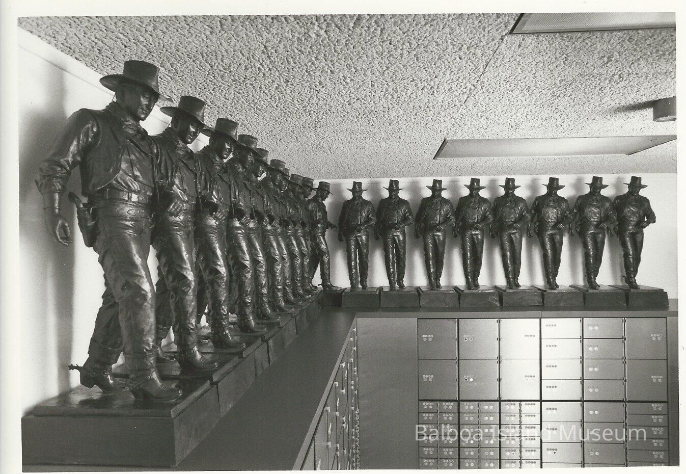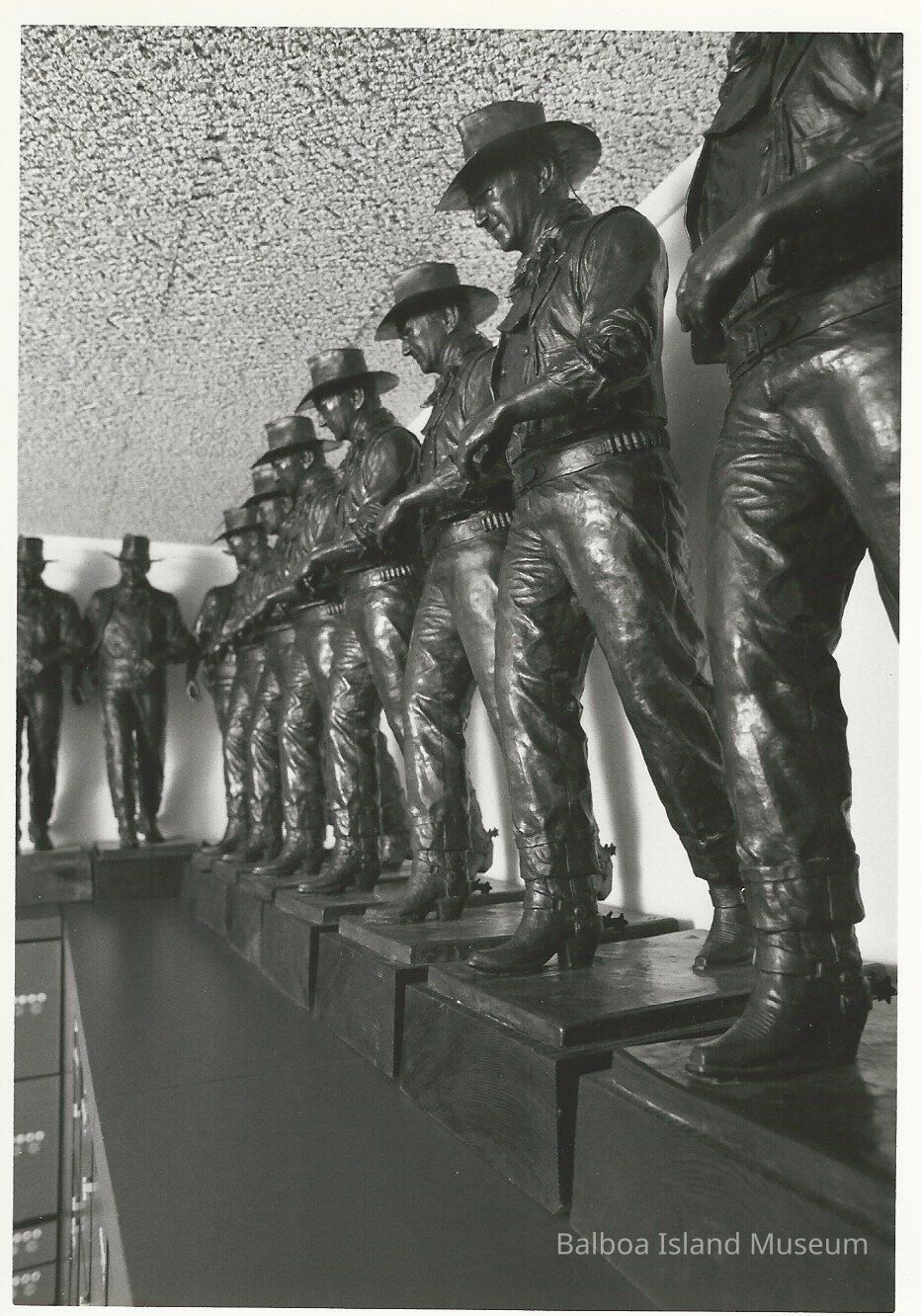 Black-and-white photographs of bronze John Wayne statues on lockers.