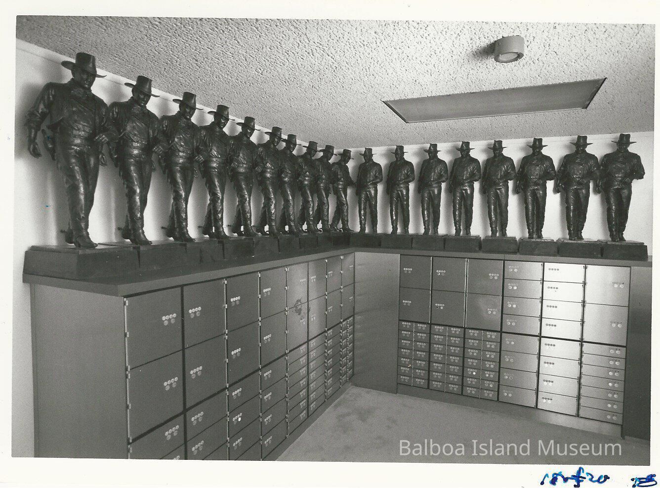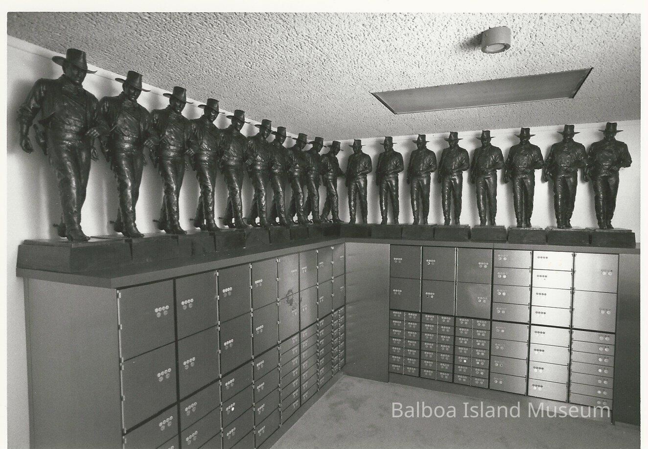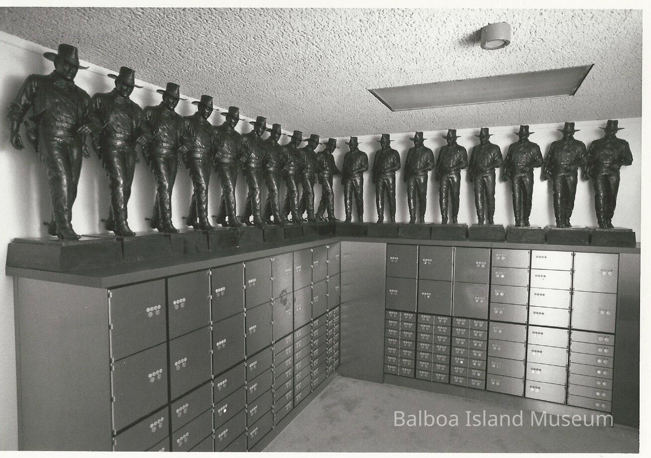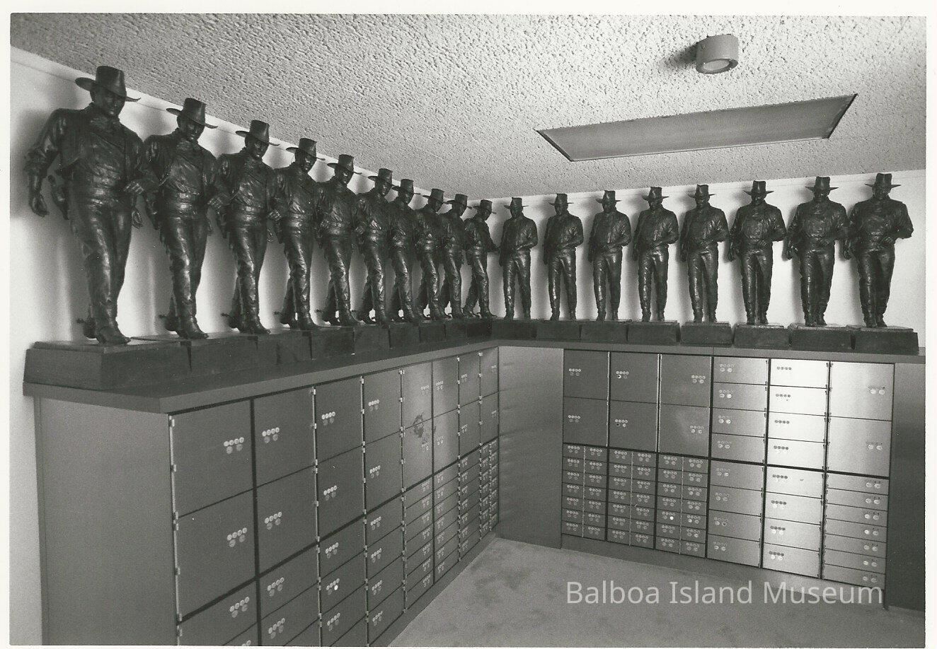 Black-and-white photographs of bronze John Wayne statues on lockers.