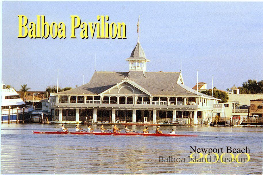 A color photograph postcard of a rowing team passing in front of the Balboa Pavilion. "Balboa Pavilion" is printed in block letters in yellow in the upper left corner and "Newport Beach 2000" is printed in the lower right corner in black and yellow.