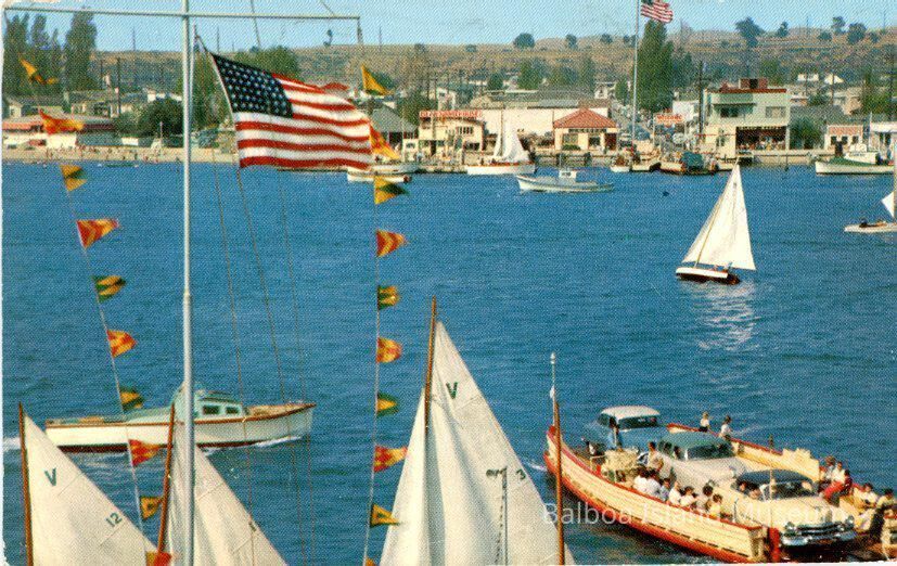 A photograph postcard of the Balboa Island ferry landing across the bay on Little island with the Balboa ferry visible in the lower right corner coming in to dock.