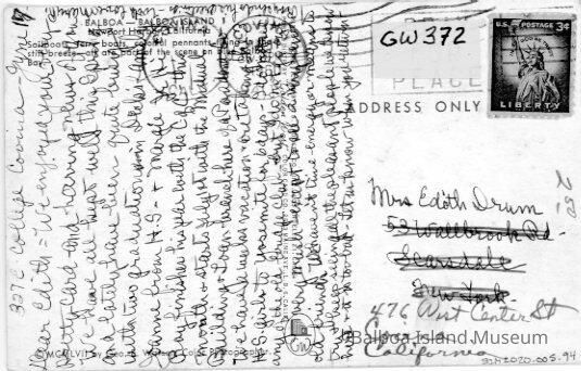 Two copies, one sent and one not. Back has a small blurb about the Balboa Island Ferry. Published by Golden West and printed by H. S. Crocker Co., Inc. The photograph is copyright George Elton Watson, 1957. Photograph taken by George Elton Watson. Postcard number GW-372.