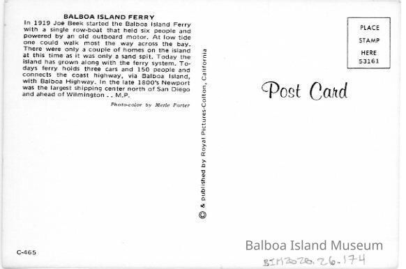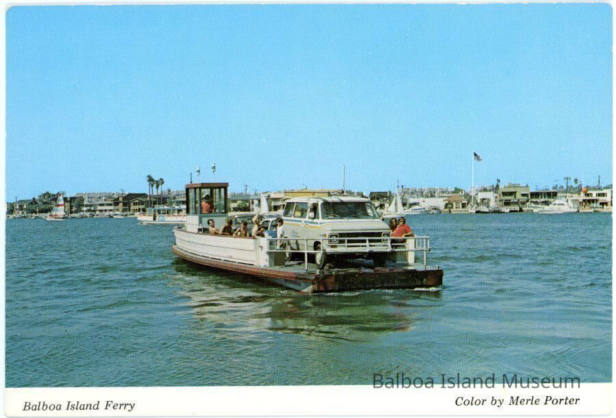 A color postcard with an image of the Balboa Island Ferry heading in to dock at the Fun Zone. THe pavilion Queen is passing behind it and the Balboa Island Ferry dock can be seen on the right side of the photograph. There is a van with a blue and a yellow stripe on the boat along with passengers and two more cars.