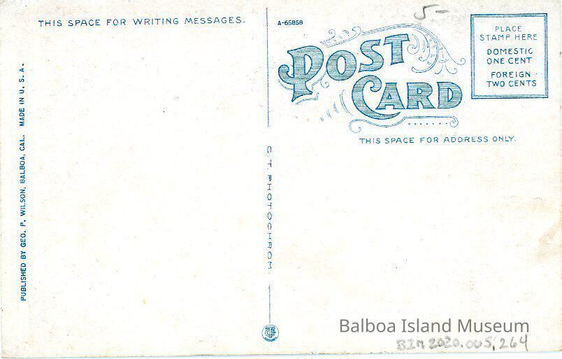 Unused. Published by George P. Wilson in Balboa and printed by Curteich-Chicago in Chicago. Postcard printer number A-65858. Stamp box reads "Place Stamp Here Domestic one cent foreign two cents" inside a box with a triple border.Subject