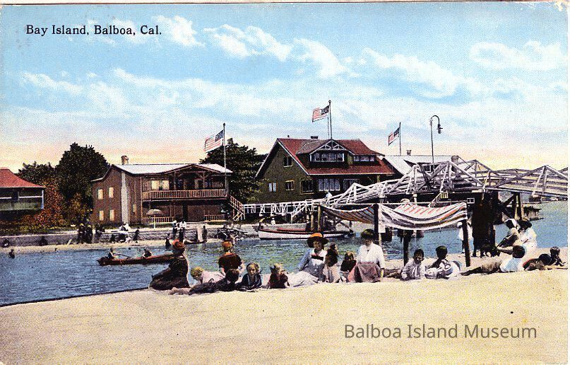 A colorized photograph postcard of people sitting on the beach across from Bay Island next to the Bay Island Bridge. The bridge and several houses on the island are visible, all of which have US flags. The group on the beach has a makeshift tent of beams and blankets. Several canoes and other boats are passing beneath the Bay Island Bridge.