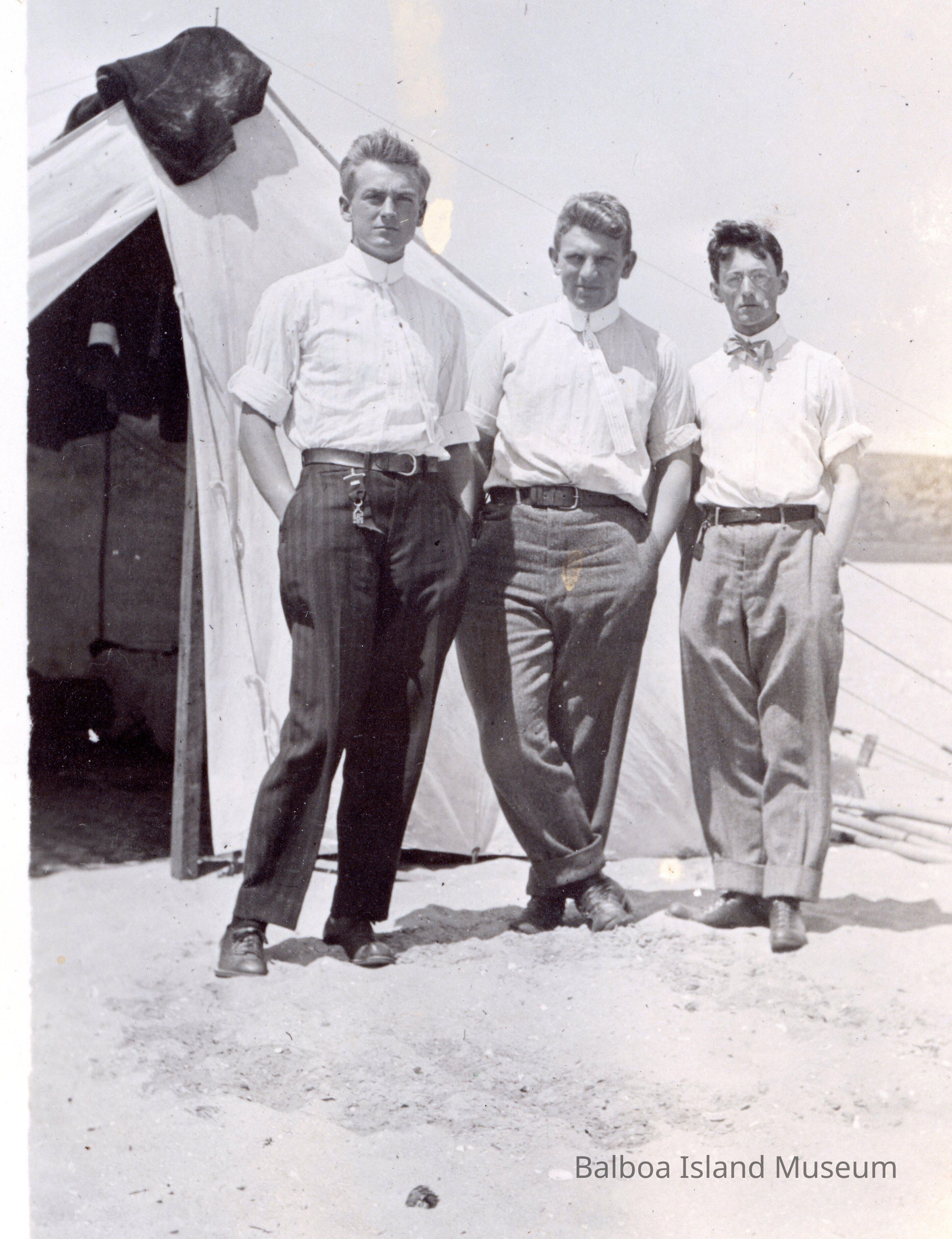 A photograph of Kenneth Smith and two other boys standing in front of their tent on Balboa Island. The writing on the back is mostly obscured but there is a remark about the "Long, [middle?] and short of it". This is likely a reference to the men standing from Tallest (Kenneth Smith) to shortest. Taken on July 4th, 1911.