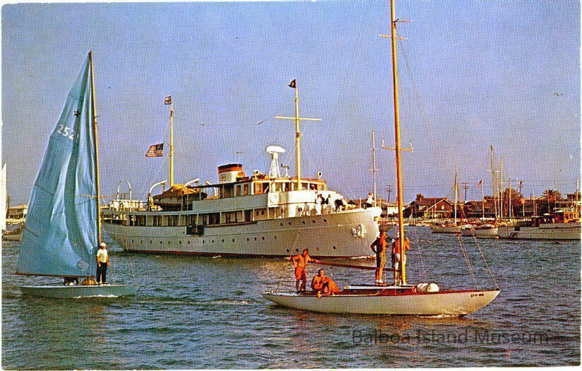 Three copies of a color postcard of a large ship in the harbor with a swiss flag painted on the stock and two masts. There is a blue sailboat and a sailboat with no sail on it sitting in front of the boat. The color for two of the images appears faded. They may have also been published at an earlier time or as part of a different batch from a different printer than the third card, which has maintained its color.