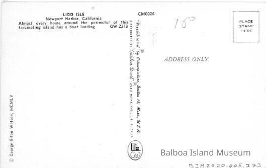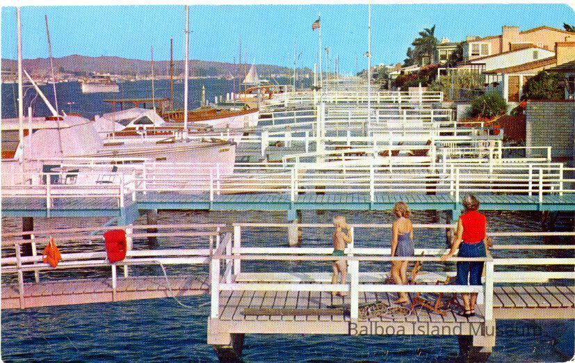 A color postcard of a family on a dock looking down a series of other docks off of houses on Lido island. Unused. Published by Golden West. Printed by Colourpicture. Photograph by George E. Watson. Postcard number GW 2313. Print number CM0026.