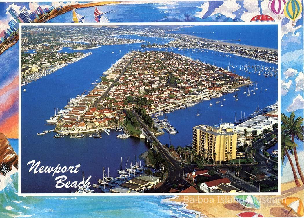 A color postcard taken from the air of Lido Island. Taken from over the Lido shops just over the Bridge from the island. There is a color boarder around the image with small paintings of a city skyline, waves hitting rocks, hot air balloons, and a beach with sand. The building at 601 Lido is very clearly visible in the bottom right along with the St. James Episcopal Church.