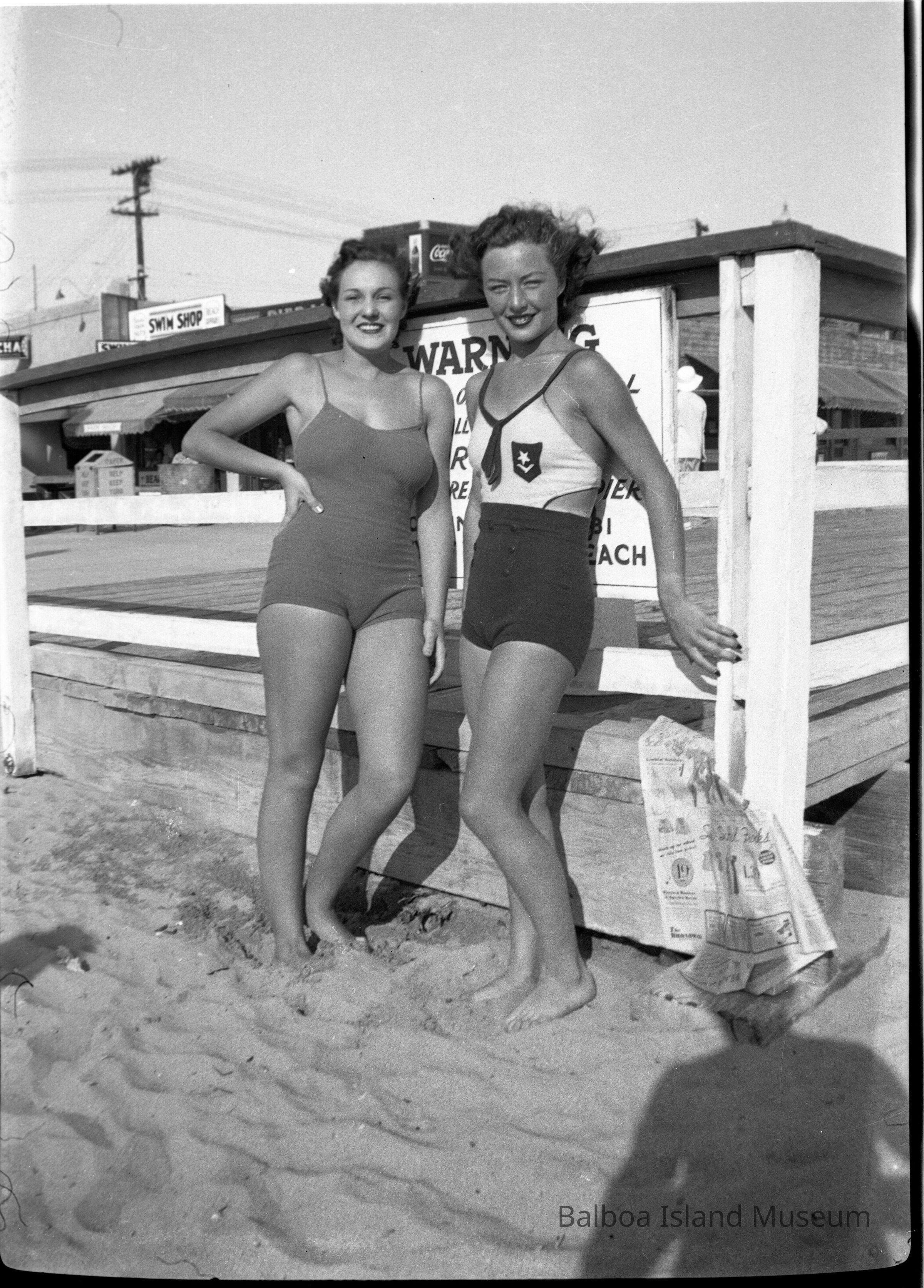 A negative photo of two female friends on Balboa Beach. The envelope with all the negatives says " The Gang at Balboa taken in 1934 Summer"