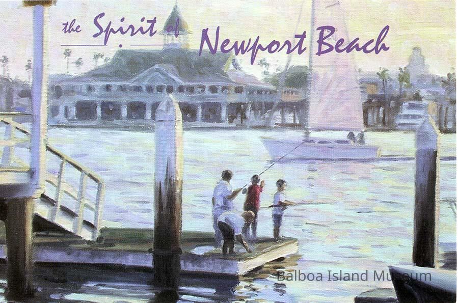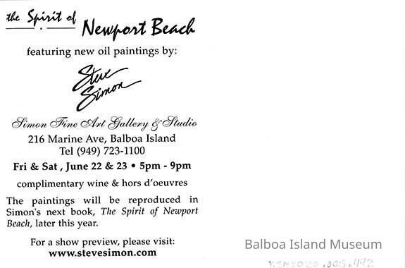 An advertisement for a book signing by Steve Simon for The Spirit of Newport beach book. The front features one of Steve Simon's paintings of children fishing off a floating dock in front of the Balboa Pavilion. This may have been distributed as a flier as the back has not been written on aside from the advertising print. The text is advertising an art showing of Steve Simon works to be reproduced in the book The Spirit of Newport Beach held on Friday and Saturday, June 22 & 23, 2001.Collection