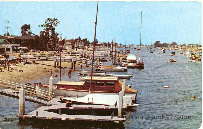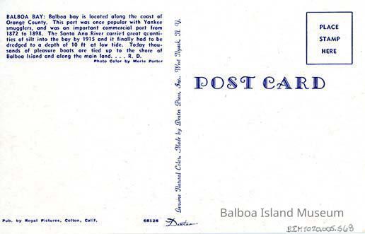 Two copies of a color photograph postcard of boats docked along North Bay Front near the 1000 block. They are docked along the Balboa Island Channel. Unused. Photograph by Merle Porter. Published by Royal Pictures in Colton. Print number 68128.