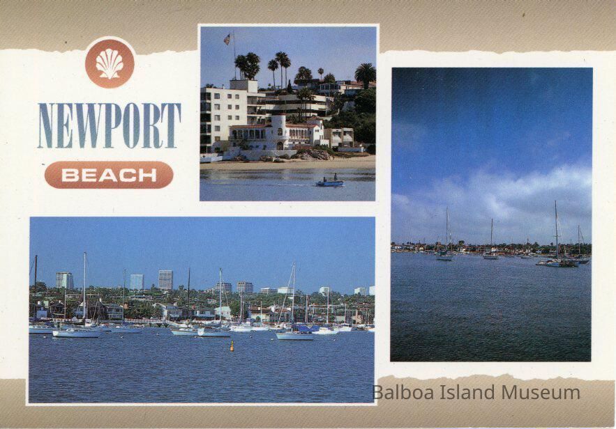 Two copies of a color collage postcard with two images of the Newport harbor, one of the harbor with many boats docked on the shore and one of the harbor with a older style sailing ship with a french fleur-de-lis. The background resembles an old map with an archaic compass rose design. Newport Bay is written in the upper left corner.