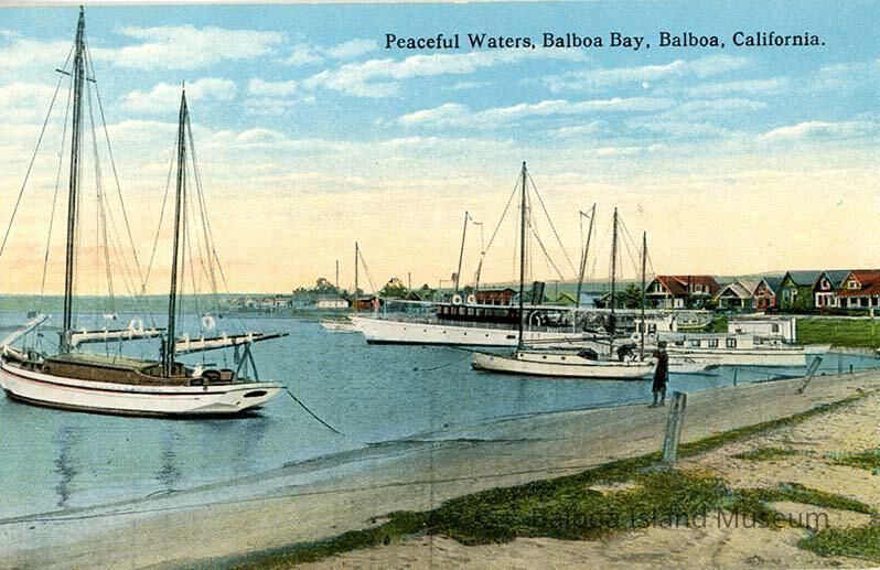 A stylized photograph of several ships in the harbor on the Balboa Peninsula, possibly near Bay Island or Balboa Island. One of the ships is very long with a smokestack.