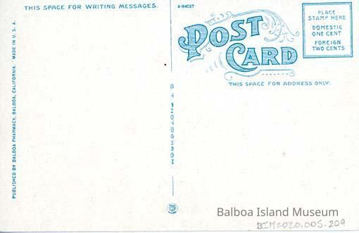 Unused. Published by Balboa Pharmacy in Balboa, California. Made in the USA. Printed by Curteich-Chicago as a C. T. Photochrom. Print number A-84027. Stamp box solid line with "Place stamp here domestic one cent foreign two cents" inside.Subject