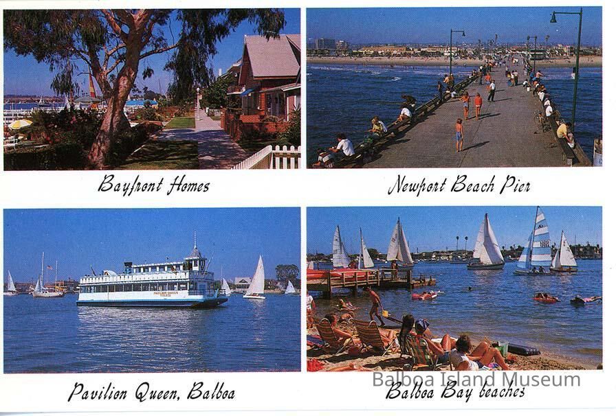 A color postcard featuring four images from the newport Beach area. The top left is a photograph of homes along a bay front street on one of the islands or the Peninsula on the Harbor side. The top right is a photograph of Newport Pier looking towards the beach. The bottom left is a photograph of the Pavilion Queen on the water and the bottom right is beach goers on Balboa, Lido or Harbor Island looking towards the Peninsula.