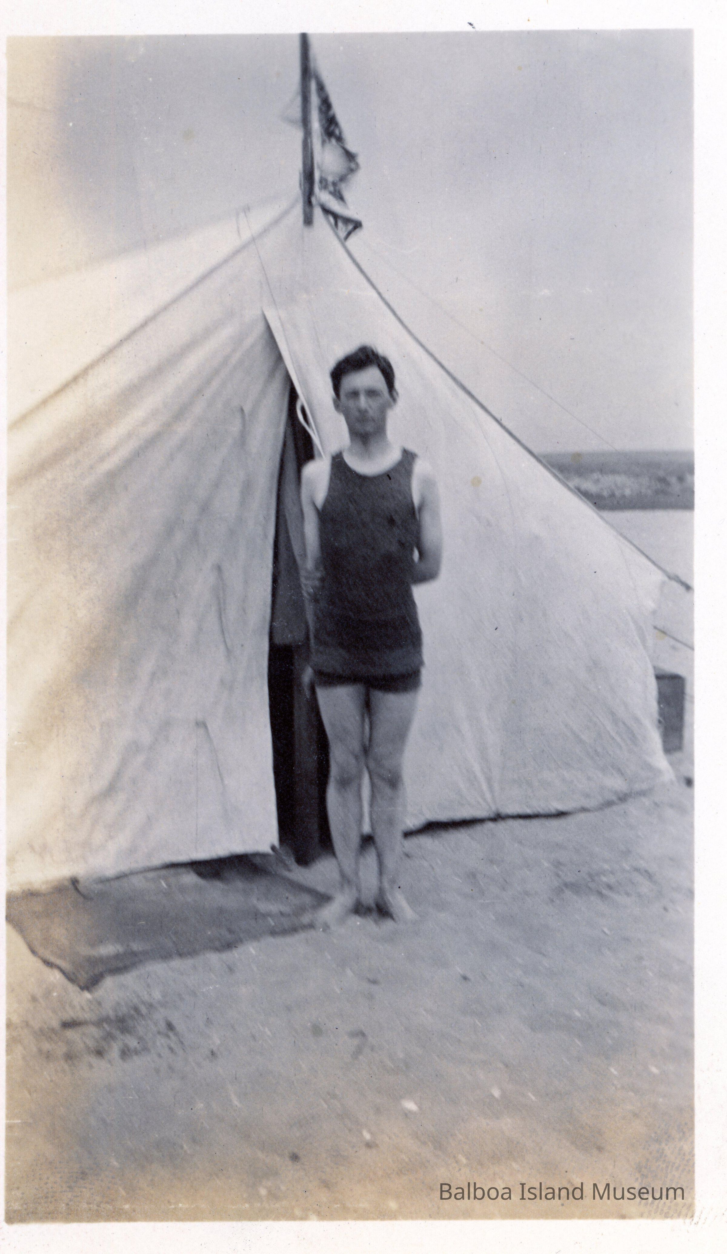 A photograph of a young man in a swimming suit standing in front of a tent on Balboa Island. He is standing straight with one arm crossed behind his back griping the opposite elbow. Taken around July 4, 1911. Adhered to black album page 1.