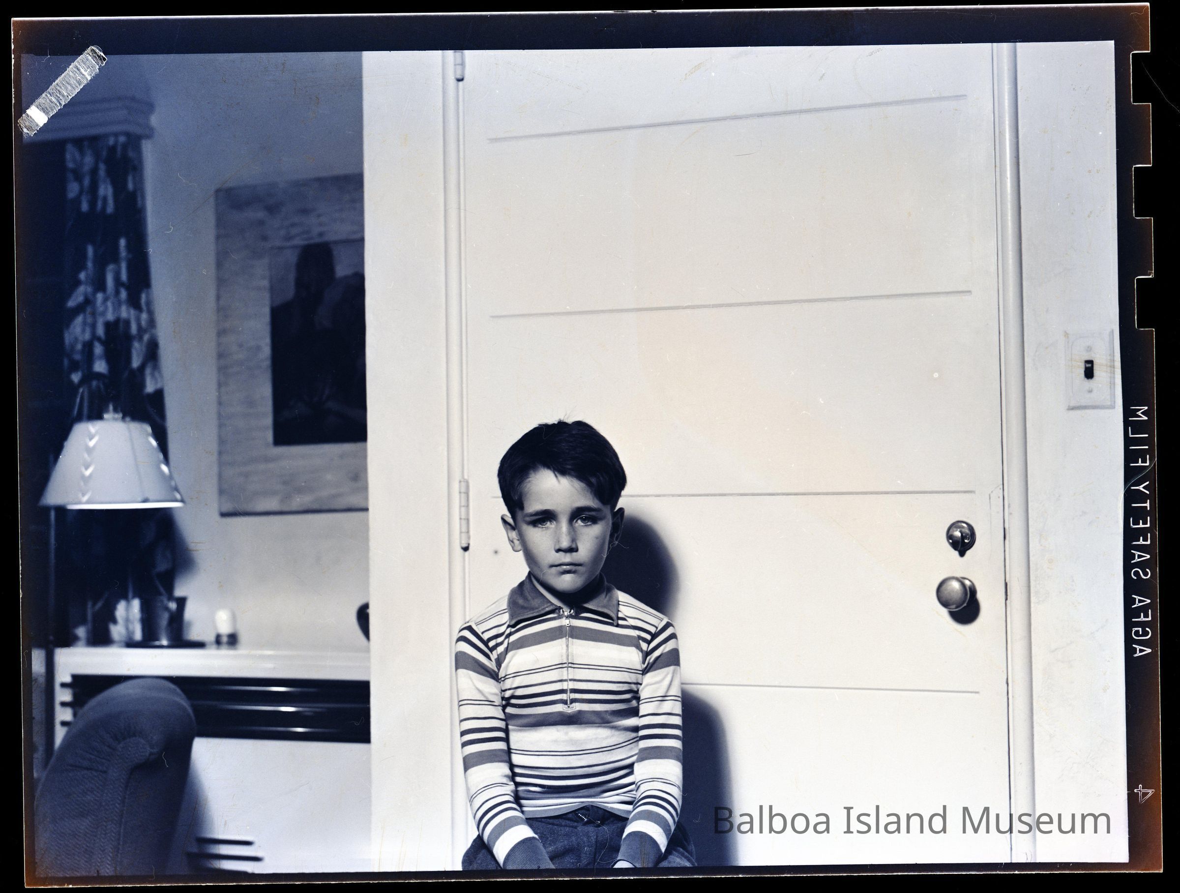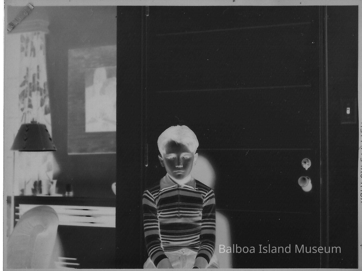 Negative photograph of a young Mike Smith sitting in a chair in front of a door. Age unknown but likely under 10.