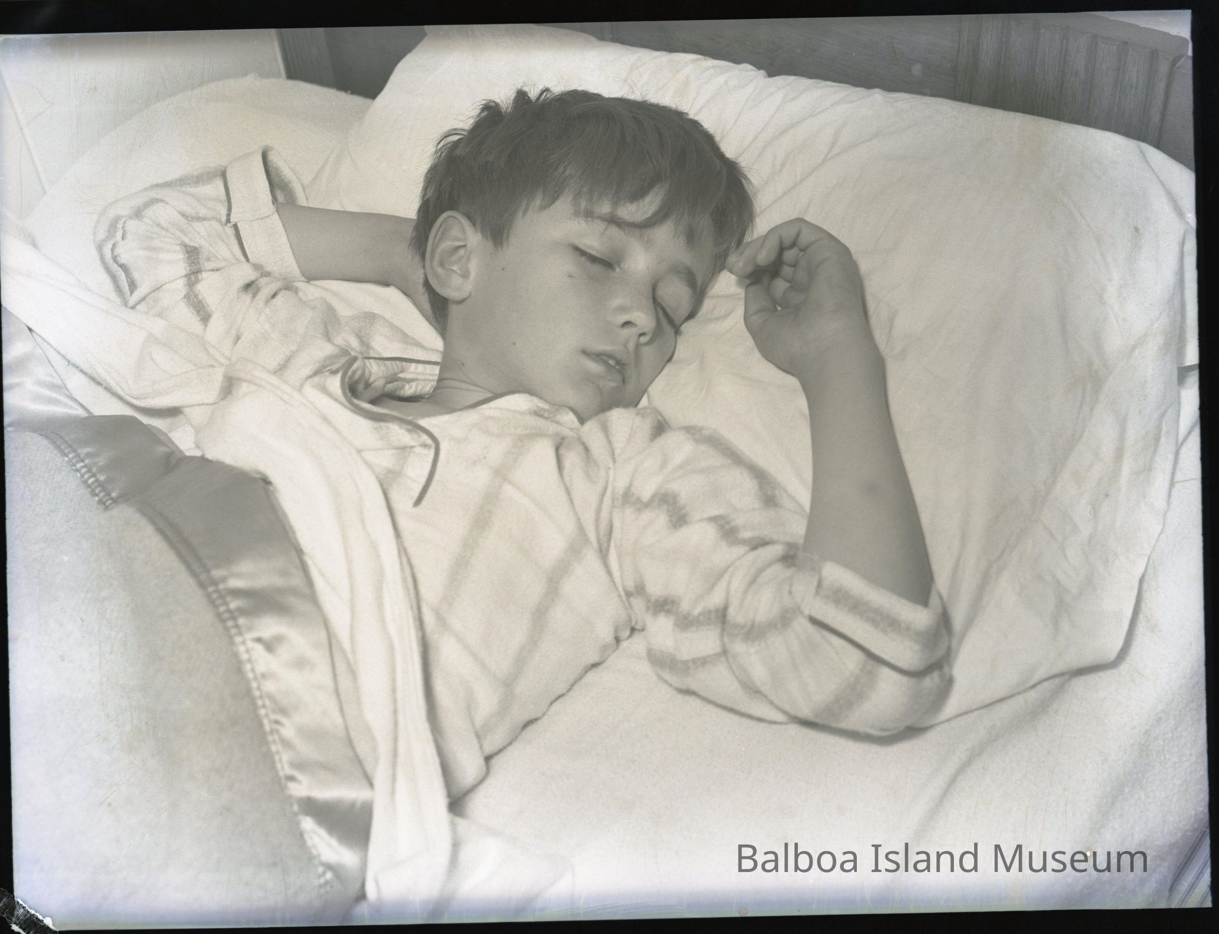 Photograph negative of Mike Smith, aged 9, asleep. He's wearing a striped shirt with his arms thrown back. Envelope reads: Mike, Feb 1942, Asleep, Aged 9.Collection