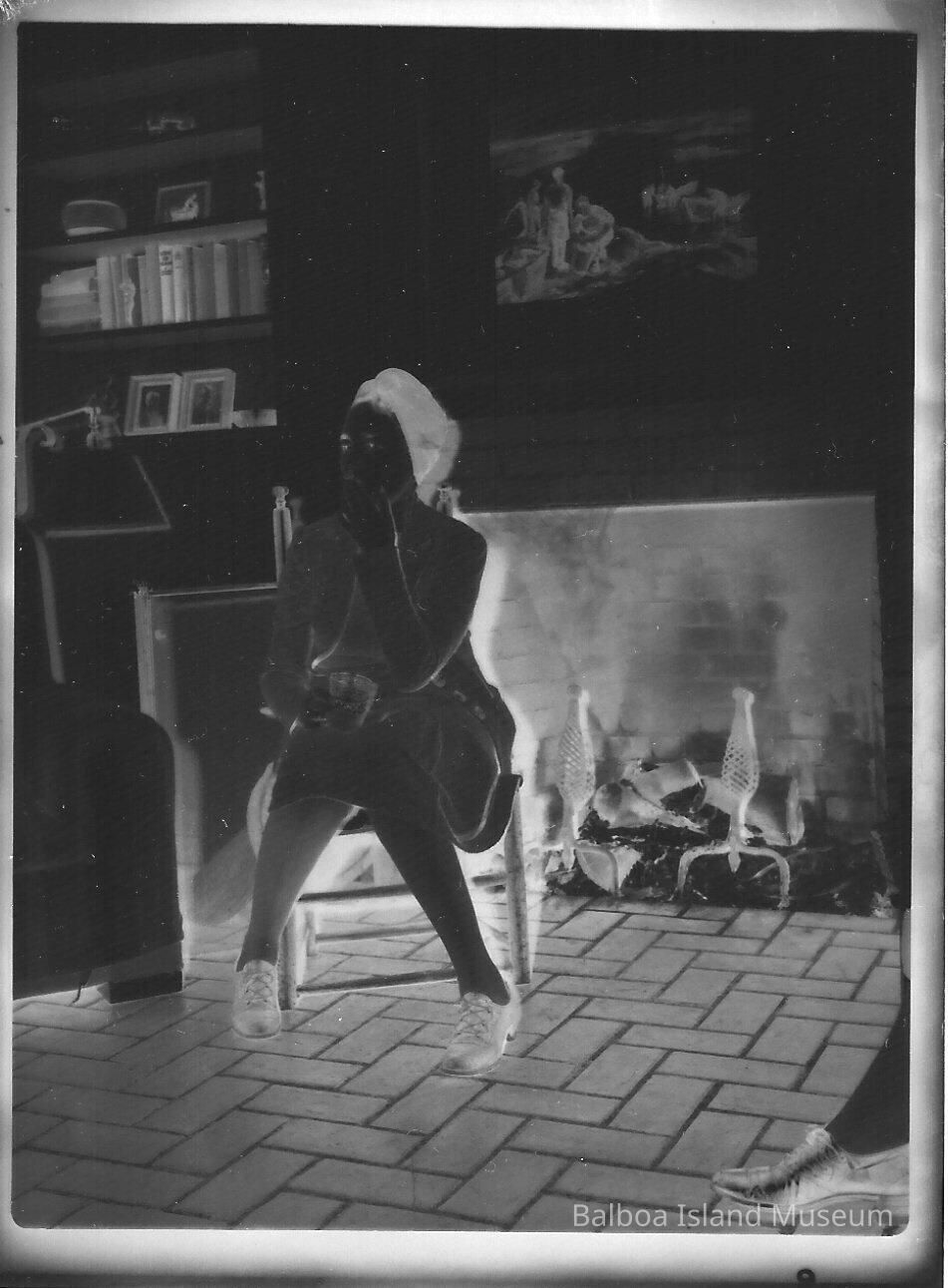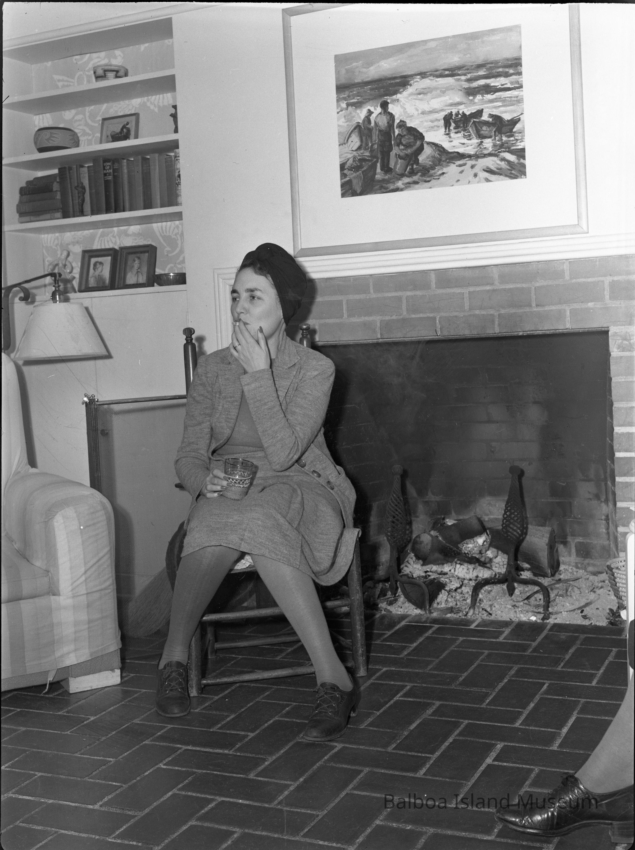 Photograph of a woman (presumably Mabe) sitting in front of the fireplace in the front living room of 108 Onyx. (Location identified through reference photo of 108 Onyx interior, Object 2017.23.19) Envelope reads: Mable Jan 1942 Flash (?)Collection