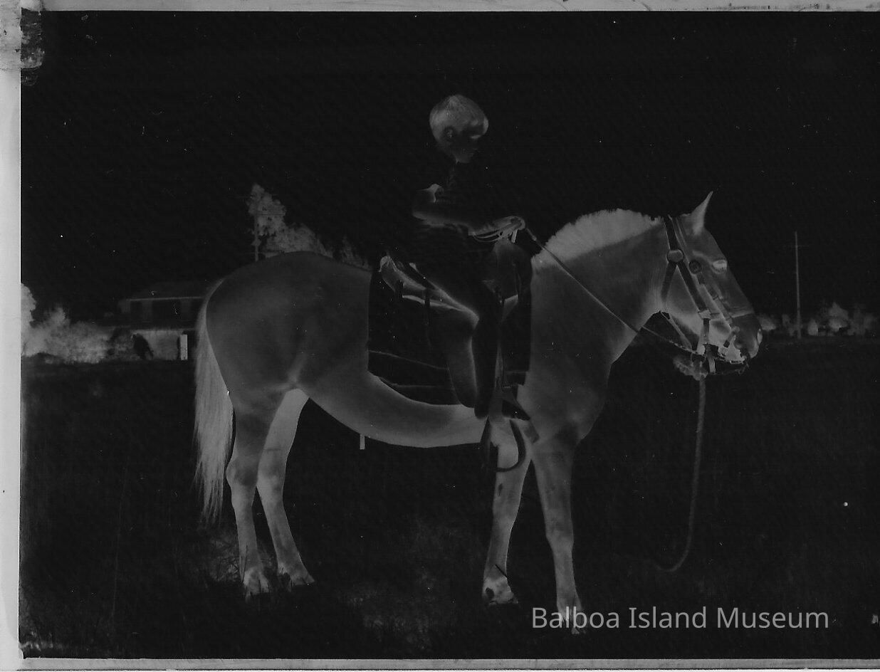 Photograph negative. Image is of Mike riding Fanny the horse. Sideways view. Mike does not appear to be wearing pants.Collection
