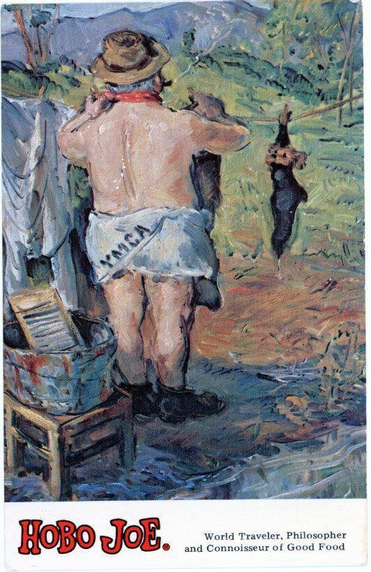 A color print of a painting of "Hobo Joe" doing laundry while wrapped in a stolen YMCA towel. His puppy is sitting in a wet sock. There is a rusty tub with a washer board on a stool or bench behind him.
