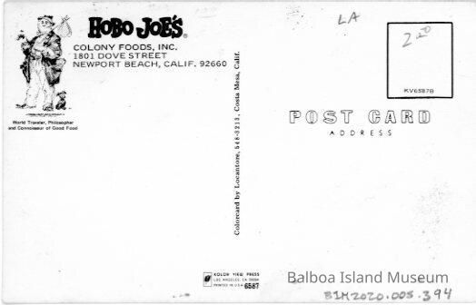 Unused. Advertising postcard for Hobo Joe's, a restaurant on 1801 Dove Street owned by Colony Foods, Inc. Print by Kolor View Press. Colored by Locantore.Subject