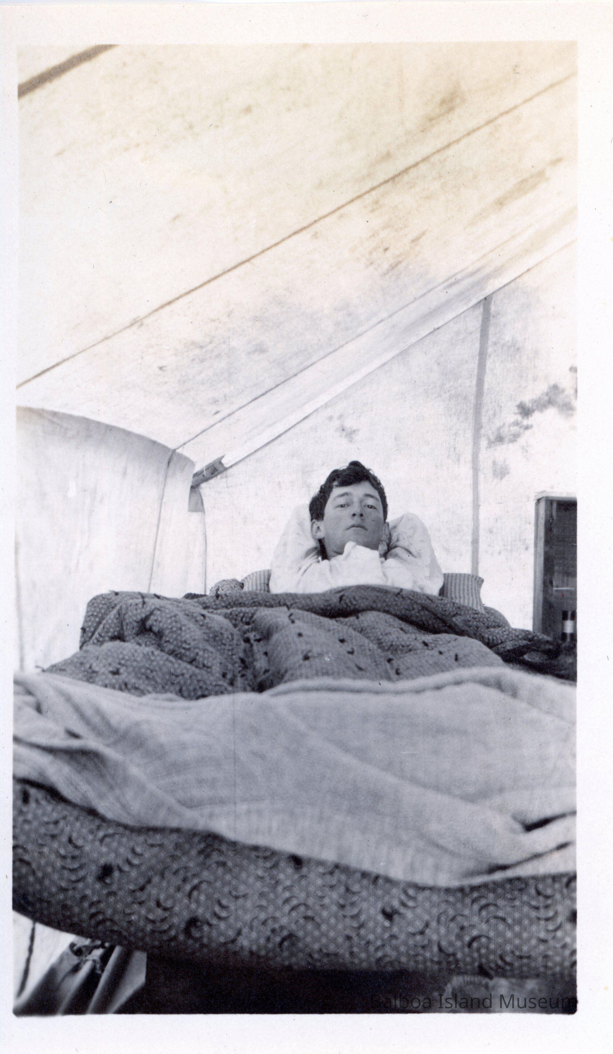 A photograph of a young man with dark hair laying on his cot inside a tend on Balboa Island. The cot is against the left side of the tent. The photograph was taken from the foot of the cot looking towards where the young man was laying with his arms beneath his head.