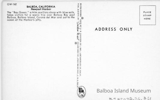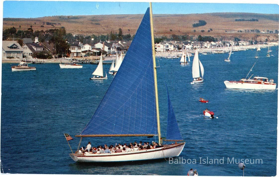 A color postcard looking towards Balboa Island from either the water or the Peninsula. The hills are visible behind it and 526 South Bay Front is visible on the left side. There is a large white sailboat with a blue mainsail and boom in the foreground.