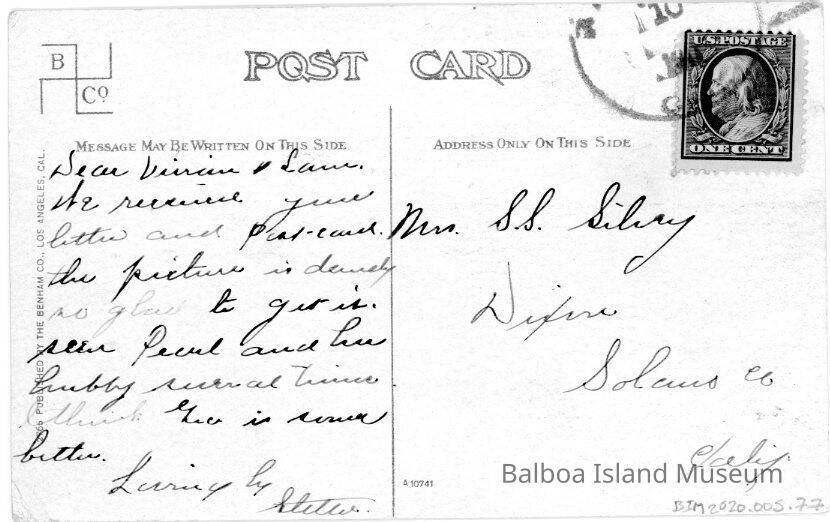 Two copies, one sent and one blank. The cards were published by The Benham Company of Los Angeles. Postcard numbers are 2765 and A10741. The second number may be a photograph number. Standard postcard back with the Benham Company icon in the upper left hand corner. The stamp box reads: "Place the Stamp here, One Cent for United States and Island Possessions, Cuba, Canada, and Mexico, Two Cents for Foreign" with dotted border.