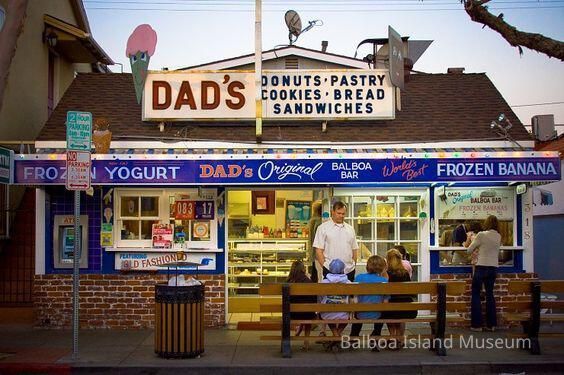 Local shop, Dad's Frozen Banana stand is featured in this photograph. A family sits on a bench in front of the eatery which serves various desserts and treats.