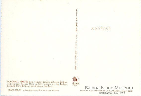 A color photograph postcard of one of the ferries heading toward the Peninsula. White bottom edge board. Newpor tBay, Calfiornia in lower left side, Balboa- Balboa Island Ferry printedin lower right side. Scalloped edges.