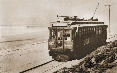 Color edited image of a Pacific Electric Railway "Red Car" at Huntington Beach