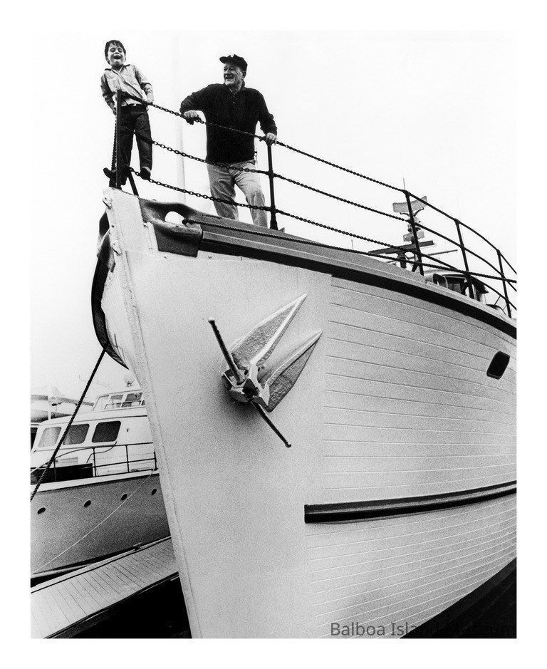 Ethan Wayne and John Wayne on top of John's boat, the Wild Goose, in 1965.