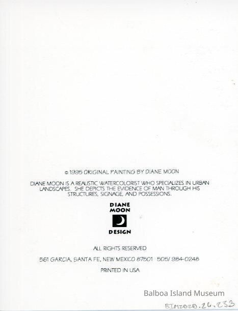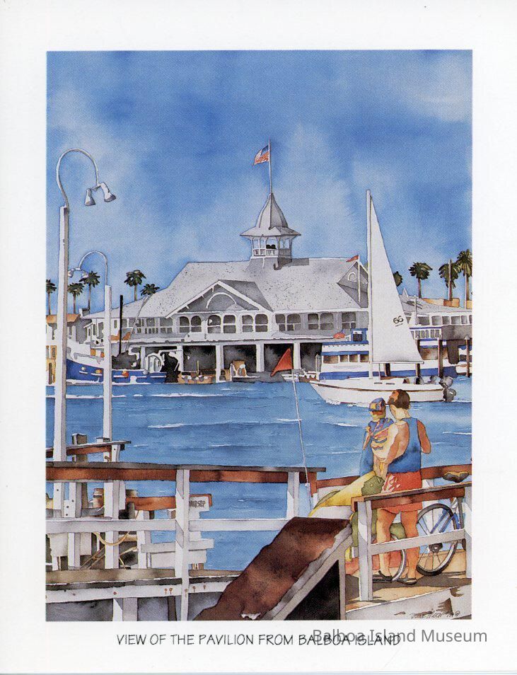 A notecard with a print of a color painting by Diane Moon of the Balboa Pavilion done fromt he Ferry dock. The title is below the painting and htere is a thick white border around the edge. Printed in the USA. Original painting copyright 1995.Collection