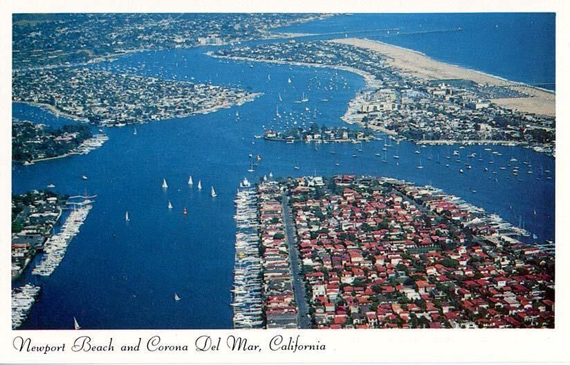 Color aerial postcard taken from over Lido Island looking towards the Harbor Entrance. Balboa island is on the left and Bay is near the middle. White border with "Newport Beach and corona del Mar, California" written in the bottom left corner.