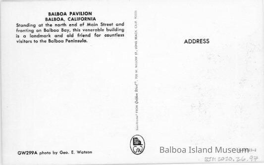 Published by Golden West in Long Beach. Photograph by George Elton Watson. Postcard number GW299A. Printer number S-49523-2.Subject
