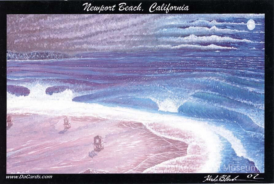 A postcard style print of a painting of the beach with waves crashing along the show and three life guard towers visible on the shore. The moon is in the upper right had side. Artist is Kirk Blesoh [?] and was painted in 2002. Printed using www.DaCards.com.Subject Place