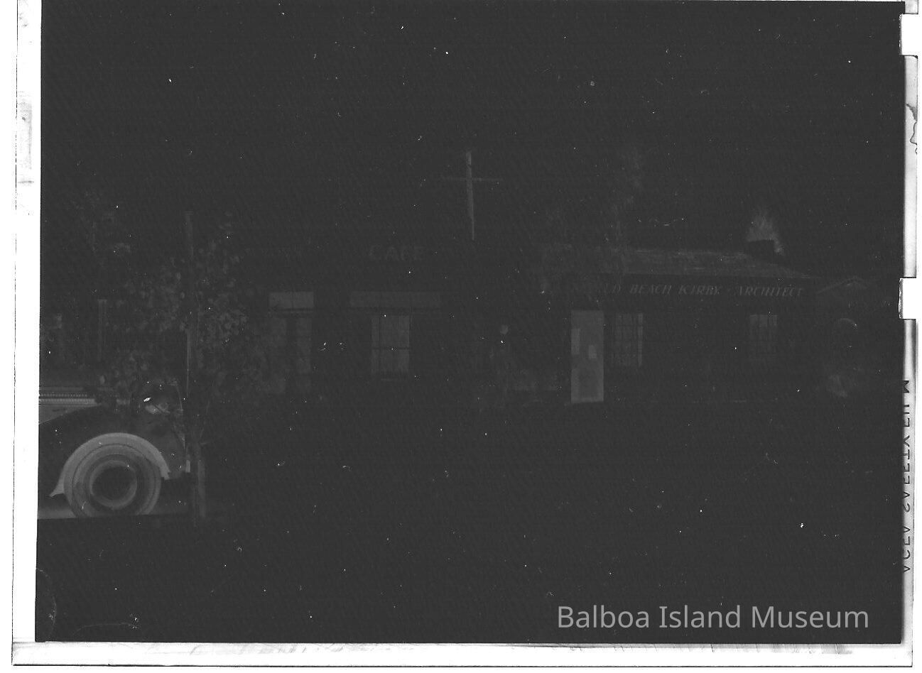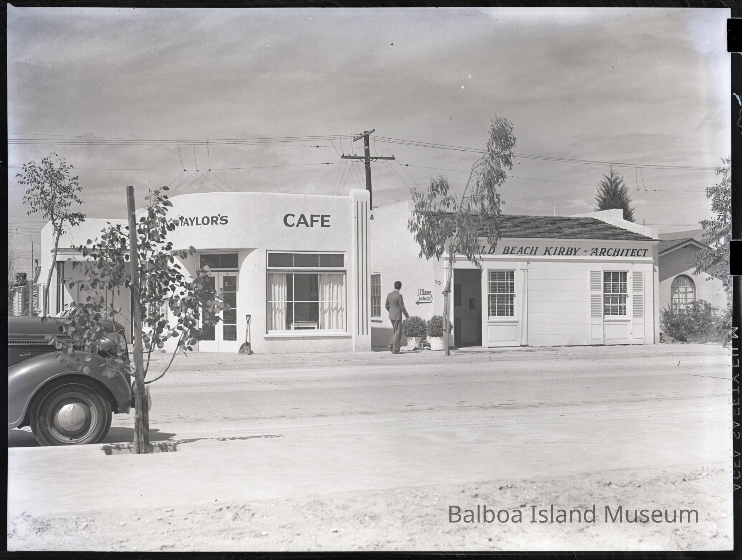 Photograph negative. Front of 313 Marine Avenue (Lot 30, Block 13, Section 4). 313 Marine was the office of an architect named Donald Beach Kirby. Also shows Taylor's Cafe (311 Marine?) owned by Ethel I Taylor and listed as her residence in 1942.Collection