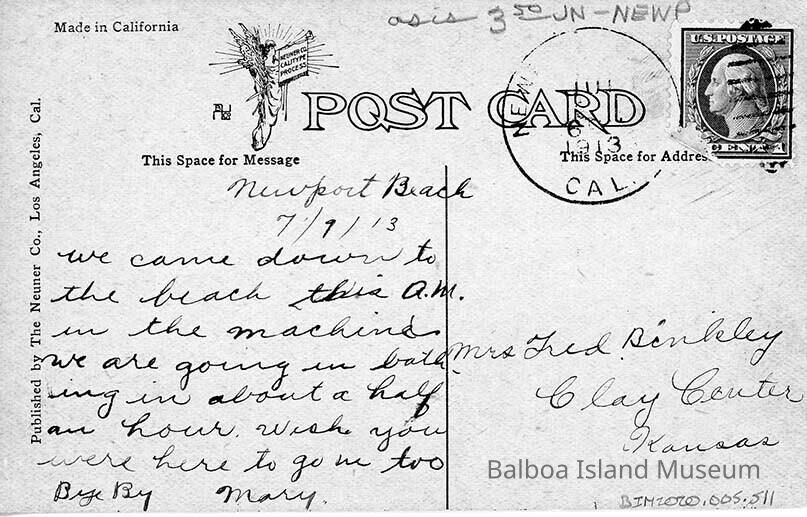 Sent from Newport Beach around July 9, 1913 to Clay Center, Kansas. Sent to Mrs. Fred Binkley from Mary.