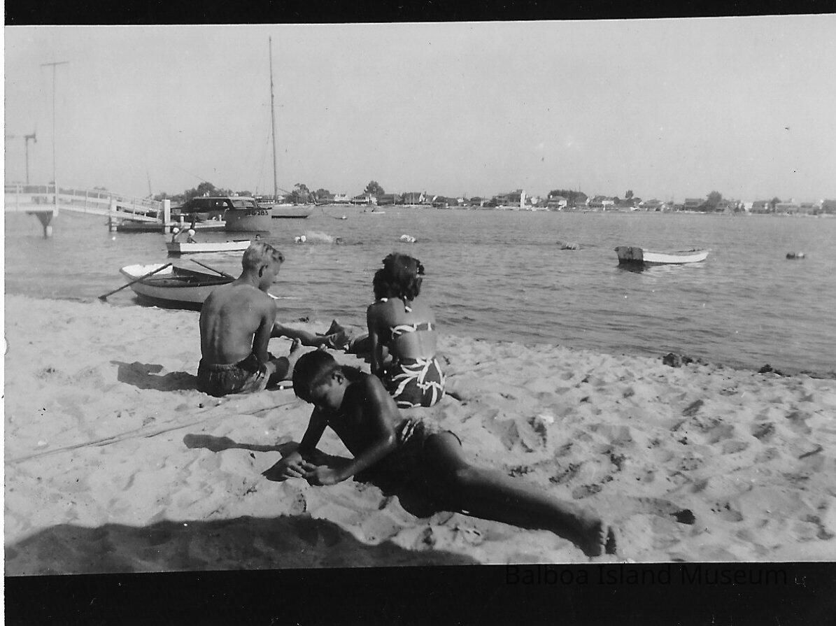 Photograph print of Mike on the beach. Year unknown. Image features Mike on the sand with a man and a woman seat behind him facing away. Includes a negative.Collection