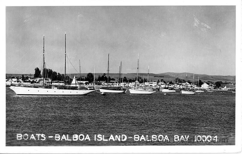 Black and White photograph of boats anchored off the shore of Balboa Island with the Beek building just barely visible behind them. There is a two masted long yacht in front.