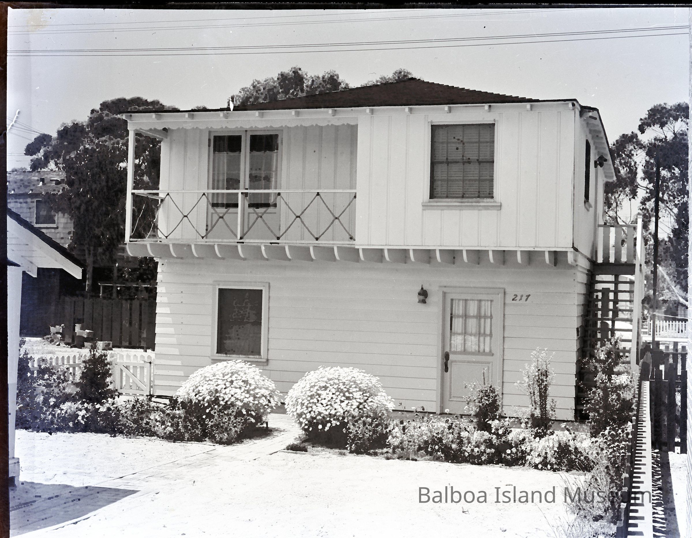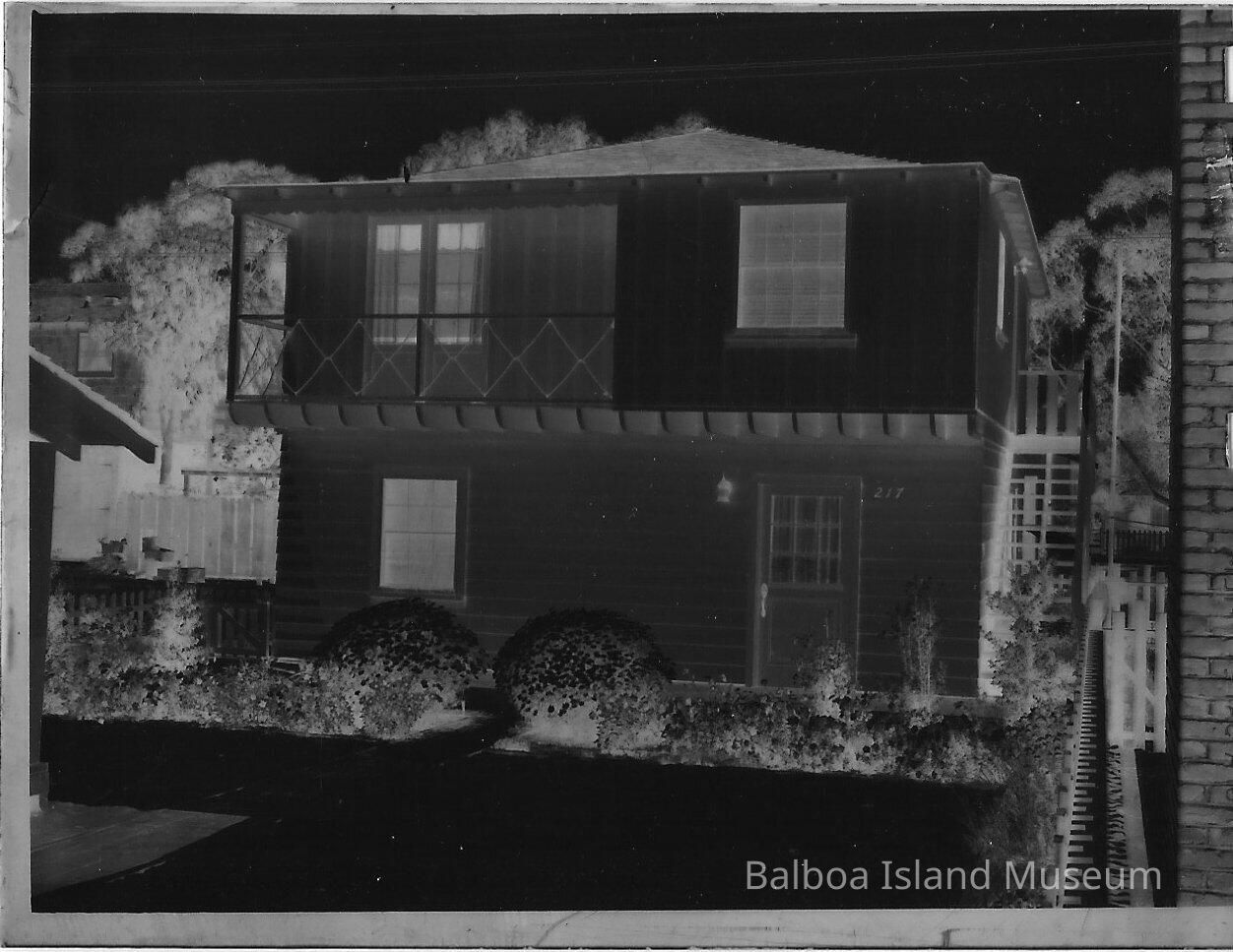 Photograph negative. Image is of a house with the number 217 printed on the front. The address is 217 Amethyst, Lot 20, Block 19, Section 3. The house is two stories tall with a balcony on the second and a stairwell on the right side of the house. The door on the front has nine glass panes in the top half and a lamp beside it on the left.Collection