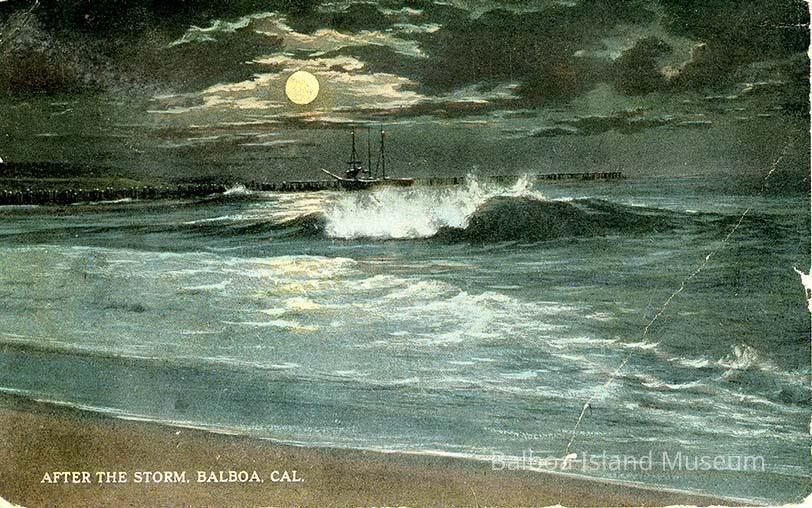 Two copies of either an artistic rendering or a colorized photograph postcard of the Pacific from the peninsula beach. A tall ship looks like it is docked at or near a pier in the background. The pier might be Newport Pier. There are large waves crashing at the shore line in the foreground.