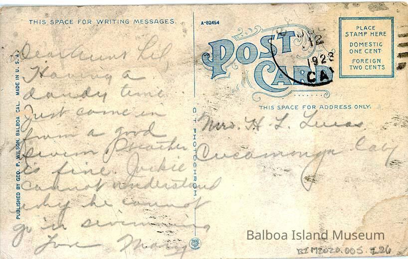 One copy is unused and one was sent July 12, 1923. The sent copy is difficult to read as it was written in pencil. Both cards were published by George P. Wilson of Balboa California and made in the USA by Curteich-Chicago. Printer number A-82454.Subject